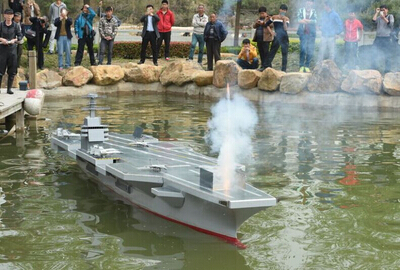 河南省航海運動站教練員侯偉介紹,這個航母模型為目前國內能下水航行的最大的航母模型,采用電力驅動,連續航行能達2小時,耗資10多萬元,歷時2年,首次試水成功,模擬導彈發射和飛機起降,均獲得成功。